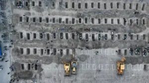Fotografía aérea facilitada por el Centro de Prensa Iraní de las tumbas durante el funeral de las niñas asesinadas en un ataque contra una escuela primaria en la provincia iraní de Hormozgan, en Minab, el 3 de marzo de 2026, durante los bombardeos de EEUU e Israel. Centro de Prensa Iraní/AFP/Getty Images/XGTY