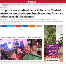 Un portavoz sindical de la policía de Madrid entre neonazis. Y menos mal que el periódico no llama a estos «personas con banderas o letreros españoles». Neonazis. De inmediato saldrá alguien hablando del «caso aislado» de este señor. Un señor que es portavoz sindical de un cuerpo armado. Es decir, habrá sido elegido por sus compañeros. ¿Saben estos que su portavoz se manifiesta en público con neonazis? ¿Saben que, además de manifestarse, insulta a personas pacíficas y desarmadas en unas actitudes que bordean la agresión física? El portavoz ha dimitido. Muy bien, es lo mínimo que puede hacer. Pero el problema permanece.